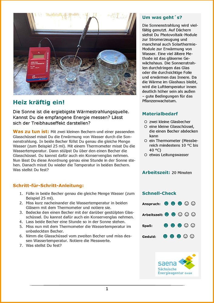 Die Sonne ist die ergiebigste Wärmestrahlungsquelle. Kannst Du die empfangene Energie messen? Lässt sich der Treibhauseffekt darstellen?